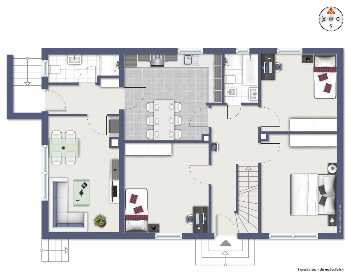• Erdgeschoss: Ein großzügiges Wohnzimmer, drei weitere Zimmer, eine Wohnküche sowie zwei Duschbäder. Von einem zweiten Flur aus gelangen Sie direkt in den Garten – ideal für Kinder zum Spielen oder gemütliche Stunden im Freien.