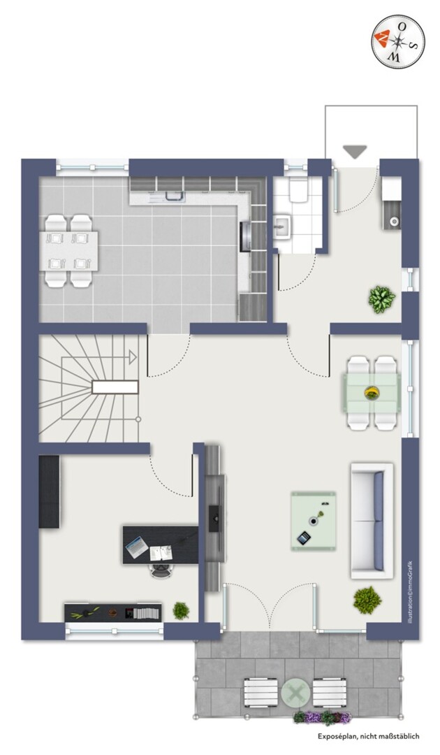 Im Erdgeschoss befinden sich ein großzügiger Wohnbereich mit Zugang zum Balkon, ein separates Arbeitszimmer, die geschlossene Küche mit moderner, hochwertiger Einbauküche sowie ein Gäste-WC.