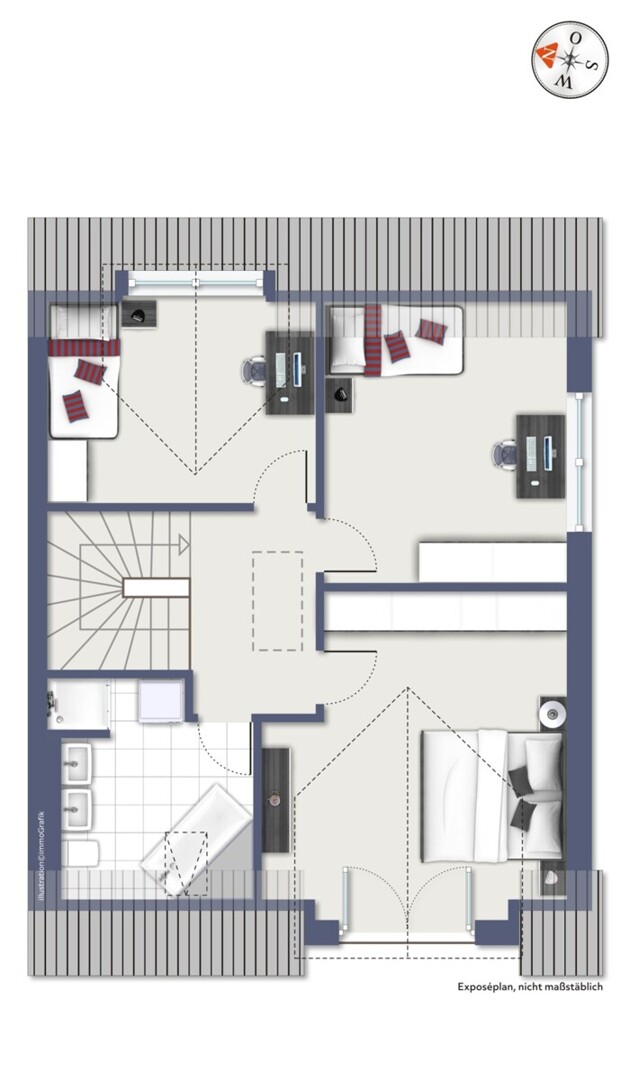 Über das innenliegende Treppenhaus gelangt man ins Obergeschoss, das zwei Kinderzimmer, das Elternschlafzimmer und ein helles Tageslichtbad mit Doppelwaschbecken, Badewanne und Dusche umfasst.